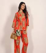 This women's orange and multi-printed pure cotton co-ord set is vibrant and effortlessly stylish. The kurta features a flattering V-neckline and 3/4th sleeves, offering a comfortable and elegant fit. Crafted from soft, breathable pure cotton, it ensures comfort throughout the day. The coordinating pants, with the same lively multi-print, complete the set for a coordinated, eye-catching look. Perfect for casual or semi-formal occasions, this co-ord set is a bold and chic addition to your wardrobe.