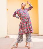 Floral print cotton cambric kurta set which perfectly sets your mood for any occasion. Long cuff detail give the kurta an extraordinary look. Front v-neckline and elasticated waistband. Kurta has two side pockets. Flared kurta pant set perfect for this summer. Kurta can be styled just as dress . Cotton fabric for relaxed summer look. Cold wash and dry clean only. Product doesn't have lining. Actual color may vary from the shoot picture due to professional lighting.