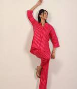 This women's red and pink textile print cotton co-ord set offers a vibrant and stylish look. The kurta features a flattering V-neckline and 3/4th sleeves, providing a comfortable yet elegant fit. Made from soft, breathable cotton, it ensures all-day comfort. The matching pants with the same bold textile print complete the set, creating a chic and coordinated outfit. Ideal for casual or semi-formal occasions, this co-ord set is a lively and fashionable addition to your wardrobe.