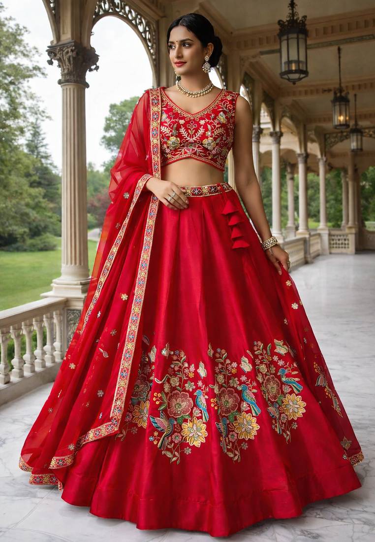 • Style : Circular Lehenga • Fabric : Art Silk • Color : Red • Work : Embroidered Dupatta Details