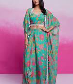 This stunning turquoise georgette crop top skirt with a shrug set. The floral print work and paper mirror border details add a touch of elegance to this outfit.
