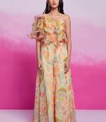 Our lovely cream organza crop top and palazzo set. The one-shoulder ruffle crop top features intricate digital print work, making it a truly stunning piece for any special occasion.