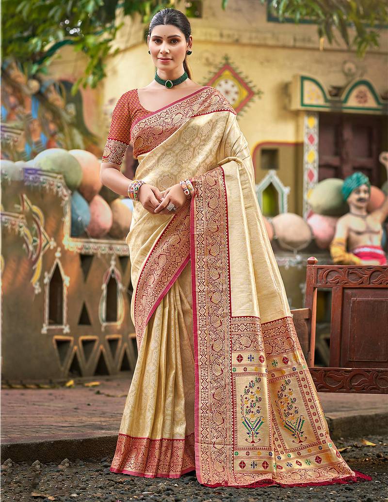 • Saree : Color- Beige / Fabric- Silk Blend • Blouse : Color- Red / Fabric- Silk Blend Saree Details
