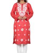 Lavangi Women's Lucknow Chikan Embroidery Work Khadi Cotton Kurti (Red)