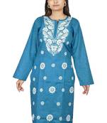 Lavangi Women's Lucknow Chikan Embroidery Work Khadi Cotton Kurti (Turquoise Blue)