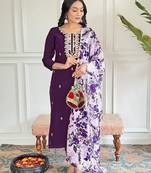 Wine Sequnec Embroidery Viscos Chanderi Kurta Set With Printed Organza Dupatta For Women