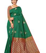 Dark Green Silk Blend Jacquard Traditional Wear Plain Solid Banarasi Saree With Woven Floral Pattern Ethnic Motifs all over and Golden Zari Rich Pallu Will Add Grandeur To Your Look. This Saree Is Ideal For Festive Wear, Traditional Wear, Wedding Reception Wear, Social Gathering. Saree Comes Along With Matching Blouse Piece That Can Be Stitched As Per Your Style And Comfort. Best If You Are Looking For Festive Wear Saree For Women Latest Design Banarasi Saree, South Indian Silk Sarees, Solid Silk Sarees Latest Party Wear, Banarasi Wedding Reception Sarees, Saree Women Latest Design 2022, Traditional Sarees For Women Wedding, Banarasi Kanjivaram Style Sarees New Collection. Pair This Saree With Open Hair/ Traditional Indian Hair Ban With Gajra, Mild Jewelry & Stylish Strap Flats.