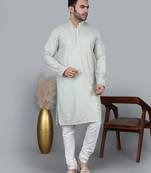 Men's Pista Green Cotton Chikankari Embroidered Kurta With Cream Churidar (Rg 50711 36)