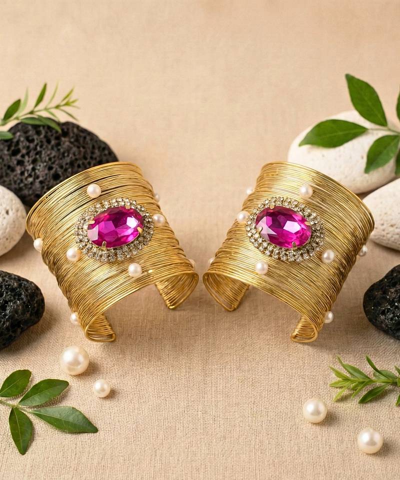 Combo Of Two Gold-plated mess wire cuff bracelet adorned with a AAA Grade Pearls placed in pattern all over the bracelet dazzling Big Hot Dark Pink Korean CZ shiny glass crystal stone.Its a Lightweight, adjustable, and perfect for elevating both casual and festive looks. A timeless statement piece for every jewelry lover.