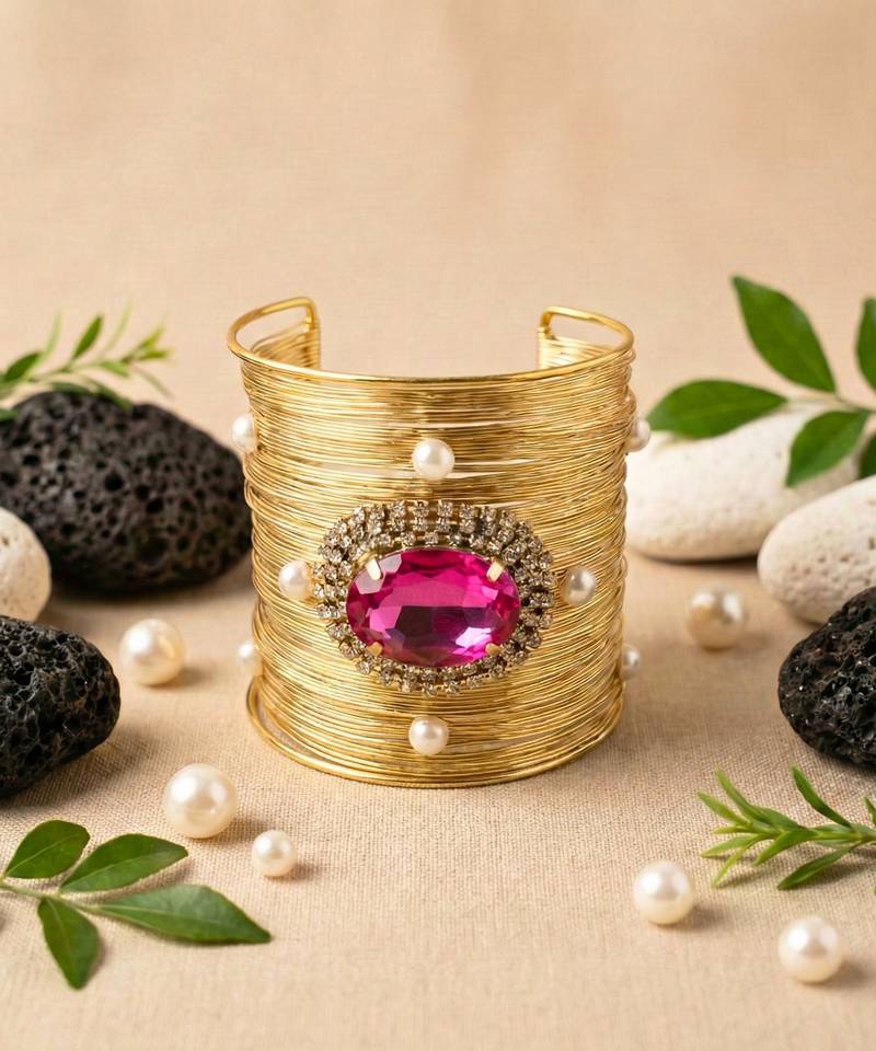 Gold-plated mess wire cuff bracelet adorned with a AAA Grade Pearls placed in pattern all over the bracelet dazzling Big Hot Dark Pink Korean CZ shiny glass crystal stone.Its a Lightweight, adjustable, and perfect for elevating both casual and festive looks. A timeless statement piece for every jewelry lover.