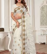 White Zari Embroidered Stone Border Net Saree With Matching Blouse Piece