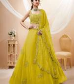 Introducing our adorable neon yellow sequins georgette wedding wear lehenga choli. This stunning ensemble features a neon yellow color georgette material lehenga with exquisite dori work, glitter sequin work, and intricate embroidery.