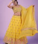 Mustard Real Mirror Thread Sequin Embroidered Georgette Indian Designer Lehenga Dress