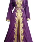 This Purple Kaftan is a perfect choice for festive occasions. Made from high-quality georgette fabric, it offers a soft and comfortable fit that drapes beautifully. The kaftan features exquisite hand-woven details, including intricate zari work, stones, and bead embellishments that add a touch of elegance. With full sleeves and a V-neck style, it provides a flattering silhouette that enhances your look. This stitched kaftan is designed for easy wear, making it perfect for parties and celebrations. Its vibrant purple color and unique design ensure you stand out in any crowd. Ideal for Islamic-style events, this kaftan combines traditional craftsmanship with modern fashion.