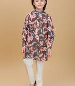 Bring a touch of the tropics to your little one's wardrobe with this vibrant floral printed shirt. Featuring a lively pattern of blooming pink flowers and lush green leaves on a deep olive background, this collared shirt is perfect for beach trips, holidays, or any sunny day out. The lightweight fabric ensures comfort and breathability, keeping them cool while they play.Paired with cream cotton pants that offer comfort and ease of movement, this outfit is both stylish and functional—ideal for weddings, festivals, or family celebrations.
