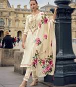 Off White Viscose Silk Floral & Leaf Embroidered Straight Kurta With Pant & Dupatta Stitched