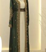 This elegant, handcrafted kaftan is made from high-quality georgette fabric, ensuring a soft and comfortable fit. The design features exquisite zari work, adding a touch of luxury to your outfit. Ideal for party wear and special occasions, this kaftan is a stylish choice for weddings and festive events. The kaftan includes a sophisticated collar neck kameez, and full sleeves, providing a flattering silhouette while offering ample coverage. The vibrant green and white color combination creates a fresh and eye-catching look. Additionally, it comes with a matching green jacket, enhancing its versatility and style.