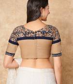 This sophisticated blouse features a stunning combination of beige and black Kalamkari, enhanced with intricate embroidery along the neckline. The elbow-length sleeves showcase a rich kalamkari fabric, adding a touch of elegance and contrast. The fitted silhouette ensures a flattering look, making it a perfect choice for festive occasions, traditional gatherings, and party wear. Designed for comfort and style, this blouse pairs beautifully with sarees and lehengas, elevating your ethnic wardrobe effortlessly.
