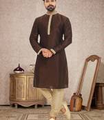 • Product Id : 4184701 • Package Details : 1 Kurta ,1 Pajama • Type : Kurta Pajama • Work : Embroidered • Sleeve : Full Sleeve • Neck Style : Round Neck • Bottom Fabric : Cotton • Top Color : Brown • Top Fabric : Art Silk • Stitching : Stitched Payments [+]