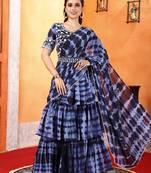 Ready To Wear Dark Blue Shibori Printed Ruffled Stitched Saree Moti Lace Embroidered Sitched Blouse And Waist Belt