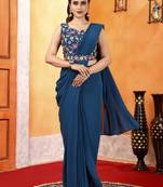 Ready To Wear Blue Georgette Saree With Unstitched Embroidered Blouse And Waist Belt