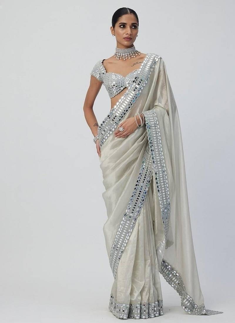 White Color Mirror Work Soft Satin Organza Silk Saree