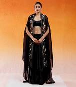 Featuring A Black Draped Skirt. Paired With A Blouse With Hand Embroidered Hem And Cape With Matching Floral Motif. Color : Black