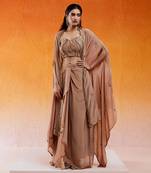 Featuring A Caramel Brown Draped Skirt. Paired With A Hand Embroidered Blouse And Matching Cape. Color : Brown