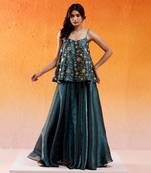 Featuring A Metallic Teal Blue Embroidered Peplum Sharara Set In Crushed Organza Base With Cutdana Seqin Moti And Resham Hand Embroidery. It Is Paired With A Flared Sharara Pants. Color : Teal Blue