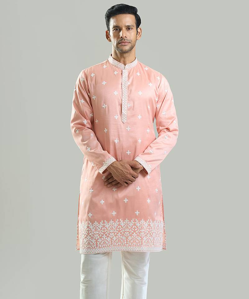 This Pink Embroidered Crepe Kurta Pajama Exudes Timeless Elegance And Contemporary Charm. Crafted From Smooth Crepe Fabric, It Features Intricate Embroidery That Enhances Its Refined Appeal. The Tailored Kurta Paired With A Classic Pajama Ensures Comfort And A Polished Silhouette, Making It Perfect For Festive Occasions, Celebrations, Or Special Gatherings.