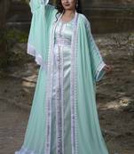 This mint green kaftan, made from soft georgette, offers a graceful and flowing silhouette. The airy fabric drapes effortlessly over a glossy satin inner lining that lends a gentle sheen to the overall look. Intricate white lace trims and shimmering embellishments run down the front and sleeves. They are complemented by a soft fringe detailing at the cuffs and hem. The piece features a round neckline and a wide, embellished waist detail that adds gentle structure without compromising comfort. Ideal for festive evenings or special occasions, this kaftan captures a serene yet striking presence.
