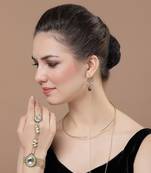 western classic pc to flaunt with neck pc and earring style; Category Of Jewellery is Necklace; Sub Category is Haar; Ideal For Women; Color is Black, Gold, White; Gemstones Used - American Diamonds, Pearls, Natural Stones; Plating is Gold-Plated; Base Metal is Metal; Other Material Used - Fish Hook; Size is Freesize; Adjustable - No; Weight is 12 gms; Mesaurements - Length of Necklace =37.5 CM; Width of Necklace = 14.5 CM; Adjustable - No; Content 1 Necklace
