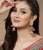 Category of jewellery is earring; sub category is jhumkas; ideal for women; color is brown, gold, cream, green, white; gemstones used - american diamonds, pearls, faux emerald; plating is gold-plated; closure is insert closure; base metal is metal; usp is american diamonds jhumkas; other material used - closure stopper; size is freesize; adjustable - no; weight is 70 gms; mesaurements - length of earring= 11 cm; width of earring =4 cm; adjustable - no; content 1 pair earring.