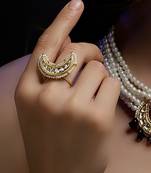 Enhance your style with this stunning ring in gold, adorned with fine kundan. Chand shaped kundan rings, this piece is perfect for weddings, parties, or everyday elegance. A must-have accessory to elevate your jewellery collection.; Category Of Jewellery is Hand Jewellery; Sub Category is Ring; Ideal For Women; Color is Gold, White, Cream; Gemstones Used - Kundan, Pearls, Natural Stones; Plating is Gold-Plated; Base Metal is Alloy; Other Material Used - Adjustable Ring; Size is Freesize; Adjustable - Yes; Weight is 7 gms; Mesaurements - Length of Ring =4 CM; Width of Ring = 3 CM; Diameter of Ring =1.65 CM; Circumference of Ring = 5.18 CM; Adjustable - Yes; Content 1 Ring