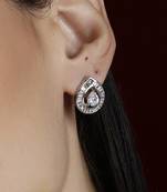 Elegant pear-shaped baguette diamonds enhancing the 1-carat round diamond, all set in a sleek silver base with a secure screw-back, creating a sophisticated and authentic jewellery feel.; Category Of Jewellery is Earring; Sub Category is Stud; Ideal For Women; Color is Silver, White; Gemstones Used - American Diamond, Natural Stones; Plating is Silver-Plated; Base Metal is Alloy; Other Material Used - Closure Stopper; Size is Freesize; Adjustable - No; Weight is 5 gms; Mesaurements - Length of Earring= 2 CM; Width of Earring =2 CM; Adjustable - No; Content 1 Pair Earring