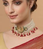 Category of jewellery is necklace; sub category is chokar; ideal for women; color is green, white, gold, red; gemstones used - kundan, pearls, natural stones, faux emerald, faux ruby; plating is gold-plated; closure is adjustable dori; base metal is sterling silver; usp is kundan chokar; other material used - adjustable dori; size is freesize; adjustable - yes; weight is gms; mesaurements - length of necklace =47 cm; width of necklace = 4.5 cm; adjustable - no; content 1 necklace.