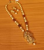 This craftsmanship evokes the aesthetic of a grand temple, with its exquisite combination of high-end polki, temple look, lustrous pearls, and gold beads. The magnificent Rudraksh adds an aura of magnificence and exclusivity to the TEMPLE LOOK PEARL & RUDRAKSH NECKLACE SET.