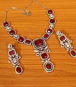 This diamond look necklace set is made in silver & brass alloy with imitation pink cz stones & cz stones of extremely fine quality. This gorgeous necklace set is handcrafted to perfection with superior quality pink colour stones & cz stones and is plated with 18kt nickle free black silver rhodium that gives the design a real diamond look & comes with a matching pair of long size earrings which are absolutely gorgeous and are light in weight.
