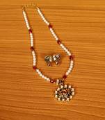 This handcrafted beautiful pendant set Is made in silver alloy with imitation ruby colour red stone & pearls and kundan with meenakari work of extremely fine quality. This gorgeous pendant set is handcrafted with fine engravings done with hand and is plated 18kt nickle free gold rhodium that gives the design a real look . the pendant comes with a matching pair of earrings which are absolutely gorgeous and are very light in weight.
