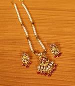 This handcrafted beautiful pendant set Is made in silver alloy with imitation ruby colour red stone & pearls, beads and kundan polki stones of extremely fine quality. This gorgeous pendant set is handcrafted with fine engravings done with hand and is plated 18kt nickle free gold rhodium that gives the design a real gold look . the pendant comes with a matching pair of earrings which are absolutely gorgeous and are very light in weight.