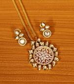 This handcrafted beautiful pendant set Is made in silver alloy with imitation mother of pearls & kundan polki stone of extremely fine quality. This gorgeous pendant set is handcrafted with fine engravings done with hand and is plated 18kt nickle free gold rhodium that gives the design a real look . the pendant comes with a matching pair of earrings which are absolutely gorgeous and are very light in weight.