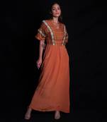 Sundial Long Dress With Geometric Embroidery On Tussar Silk Colour : Orange