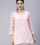 Hand Embroidered Peach Georgette Lucknowi Chikan Kurti With Slip