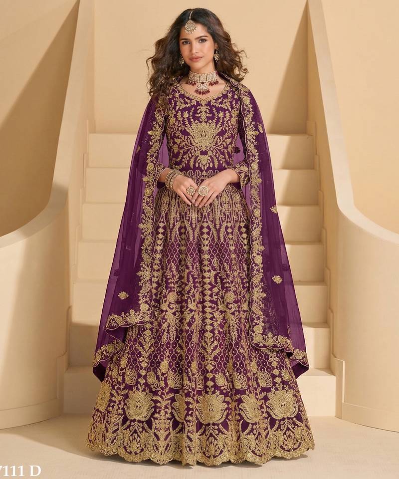 Wine Net Anarkali Salwar Suit Gown In Net Semi stitched