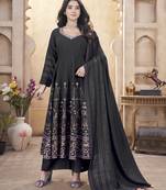• Product Id : 4525262 • Package Details : 1 Top/1 Bottom/1 Dupatta • Type : Anarkali Suit • Region : Other • Type : Anarkali Suits • Look : Designer • Sleeve : Full Sleeve • Neck Style : Round Neck • Fabric : Silk • Color : Black • Work : Foilage Print • Stitching : Stitched Payments [+]