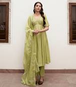 Noor kurta set in a pista green shade features V-neck and A-line kurta with kutdana embroidered bodice paired with straight pants and kota silk dupatta with lace detail.