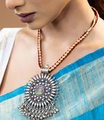 This silver necklace carries a bold, heritage-inspired design with a circular pendant at its core. The centre features a finely hand-painted motif enclosed in enamel, surrounded by raised oxidised beads and bordered with pointed silver elements that radiate outward like a sunburst. Small ghungroos hang from the base, adding gentle sound and movement. The pendant is strung on a hand-braided cord in maroon and gold threads, giving the piece a rich, traditional character.