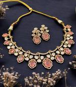 Adorned with soft pastel pink oval stones, this choker-style necklace brings a touch of femininity and elegance to your ethnic wardrobe.Set with uncut-style white Kundan stones High-shine gold plating with delicate frame work enhances each stone's brilliance, lending a luxurious and polished look. Earrings featuring a cascading design of Kundan petals and a central pink gemstone—perfectly balancing boldness and grace.Taditional silk thread dori at the back, allowing you to adjust the fit comfortably around your neckline.A beautiful choice for weddings, sangeet, Diwali, or any grand celebration—pairs seamlessly with sarees, lehengas, or Indo-western outfits.