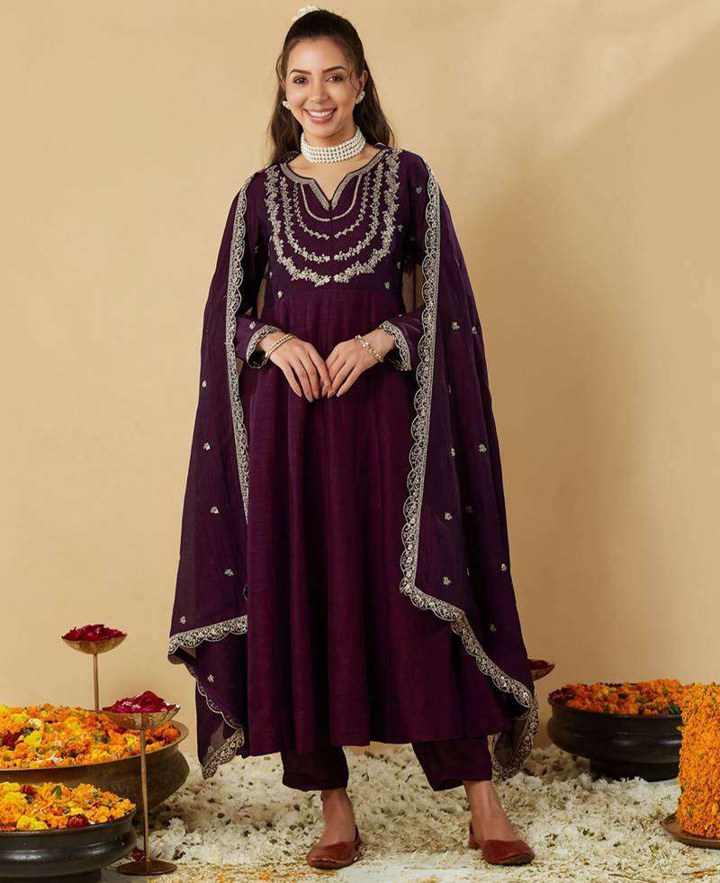 Elevate your festive wardrobe with this elegant Women’s Anarkali Kurta Pant with Dupatta Set, crafted in rich Vichitra Silk for a graceful and fluid drape. The kurta features intricate embroidered work around the neckline and yoke, highlighted with delicate motifs that enhance its ethnic charm. Designed in a classic Anarkali pattern, it offers a flattering flared silhouette with a luxurious fall. Paired with a matching pant and a beautifully finished dupatta.