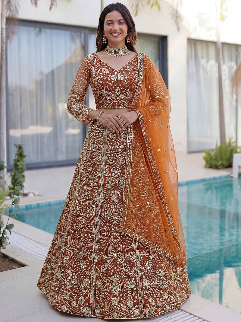 If you find the product for less we'll match it! Know MoreThe lehenga is crafted in a rich rust orange net fabric with heavy gold sequins and codding embroidery. It is semi-stitched with a waist up to 42 inches, 42-inch length, and 3-meter flair, along with micro cotton inner, cancan, and canvas.